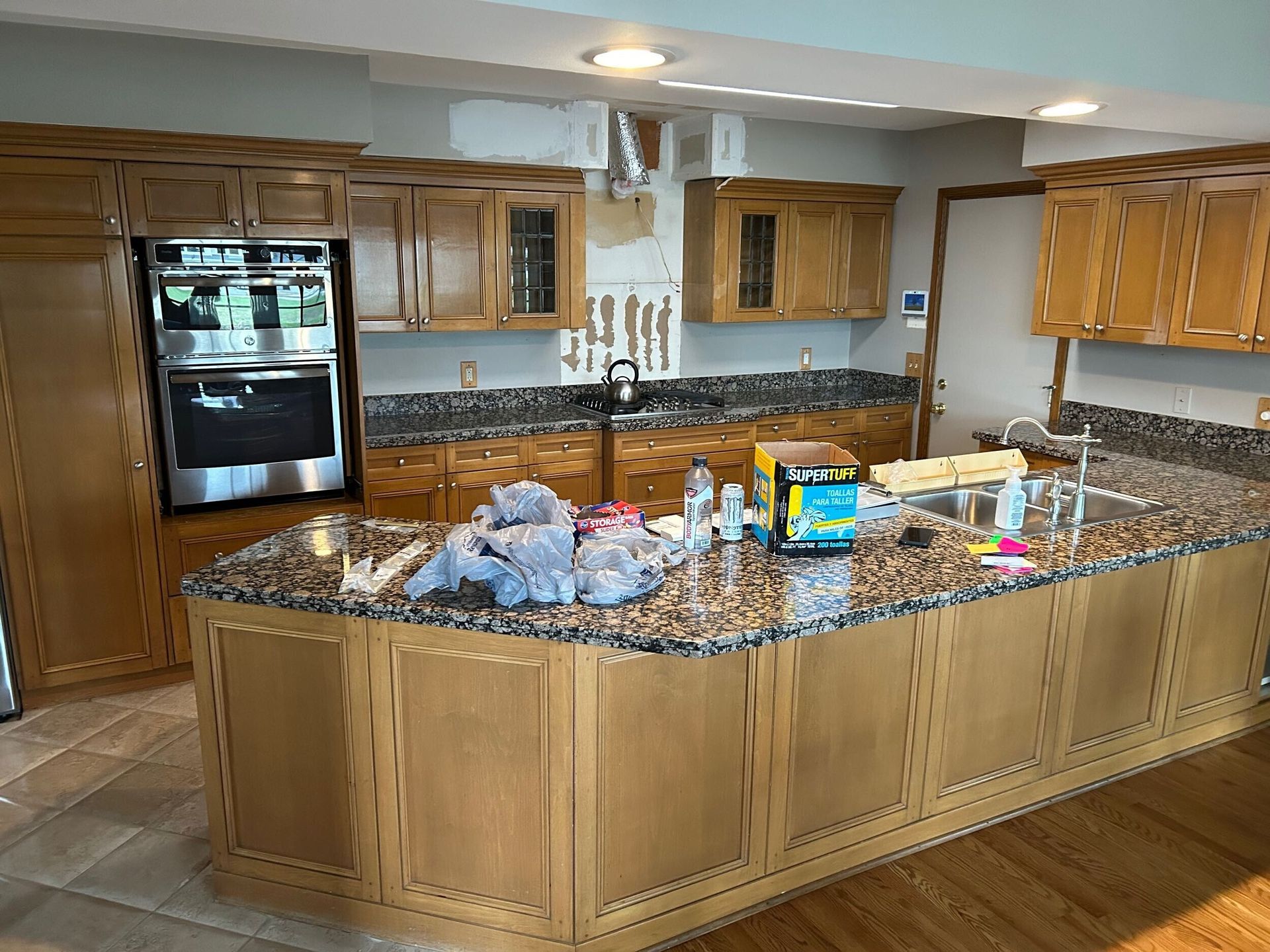 Our installation team places drop cloths to protect the area and removes all doors, drawer fronts, and hardware.